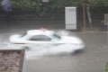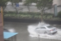 Shanghai Lujiazui CBD, typhoon shoot in hurricane winds. Business cars race to beat flooded streets. Difficult shoot conditions camera stabilizers do not work well, in such extreme wind.